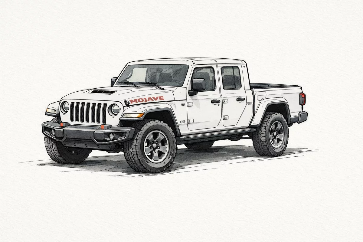 2026 Jeep Gladiator Mojave — White. Rugged, refined and ready to run: Mojave-tuned off‑road suspension with performance shocks and raised ride height gives you desert‑tested capability, while the Gladiator’s open-bed utility and confident 4x4 drivetrain handle work and weekend adventures with equal ease. Modern tech and creature comforts keep every drive enjoyable, and it’s backed by basic, powertrain and rust warranties for extra peace of mind. Stop by for a test drive and see why the Mojave is built to do more.
